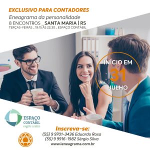 INVESTIMENTO: Associados do SINCOTEC-SM – R$ 2.750,00 com condições especiais. Demais participantes – R$ 3.300,00 ** À VISTA para qualquer participante R$ 2.500,00 Mais detalhes: http://ieneagrama.com.br/agenda/mes/07/ano/2018